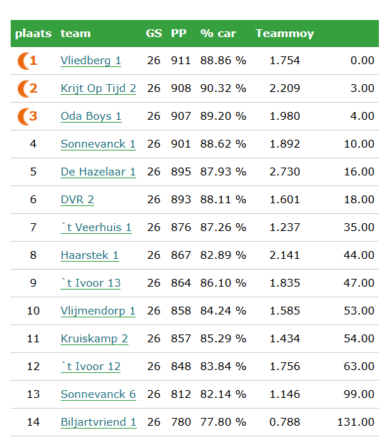 Van onze teams kunt u op www.biljartpoint.nl alle gegevens en resultaten terugvinden.